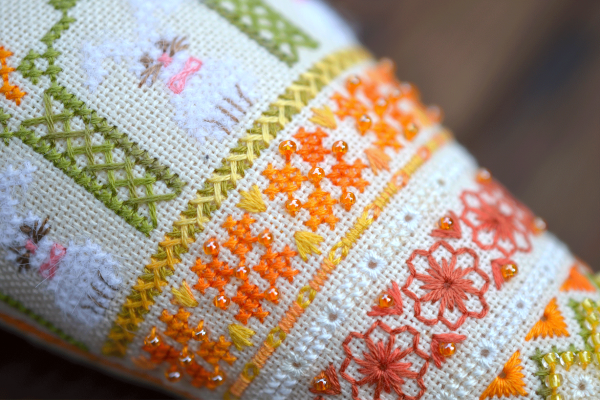 Окрім хрестика присутні віялові стібки, різноманітні вічка, козлик, настилування, штапівка, бекстіч для збірки, бісер.