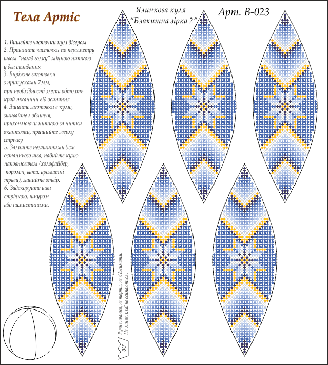 На схему нанесена докладна покрокова інструкція з вишивки та збирання ялинкової кулі.